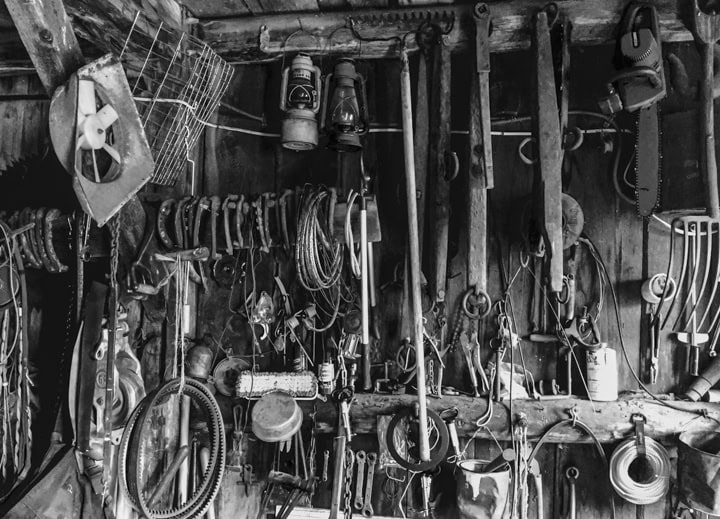 The other photo is from the blacksmith shed. Inside is an astonishing array of what seems like useless junk but every bit is being saved for a future use and Roger knows where it all is. The shot is on the east wall by the window (notice the light creeping in on the lower left) where Roger hangs…well, stuff. Don’t you dare move any of it! He’ll know.