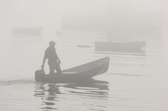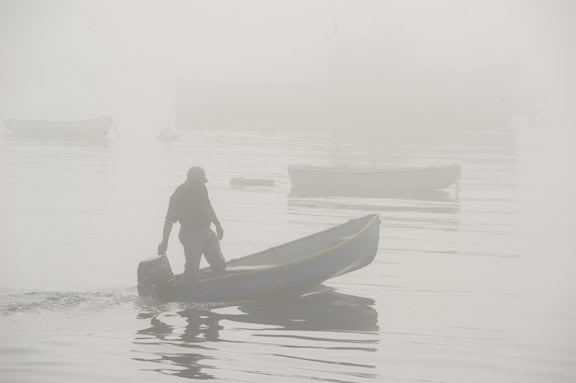 On the example I have included here I saw the lobstermen heading out to his boat in the fog and saw that there was a brief window in which he would be nicely framed by the boats in the background. I took a total of 8 shots. In 6 of those shots the lobstermen’s head or arm was turned is such a way that the composition suffered. In the shot I selected, the lobsterman’s head was up and turned so I could make out his face and brim of his hat and his right arm was not merged with his right leg.