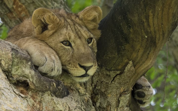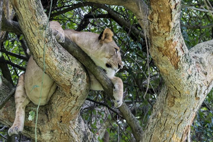 By the way, the lions were about 25 feet away up in a tree right above our vehicle. Once we got the vehicle in the right place we had 10 magical minutes with them. They showed no discomfort and very little interest in us. Quite remarkable really. Then a thunder storm rolled in and down they went, disappearing into the brush. It was quite an experience.