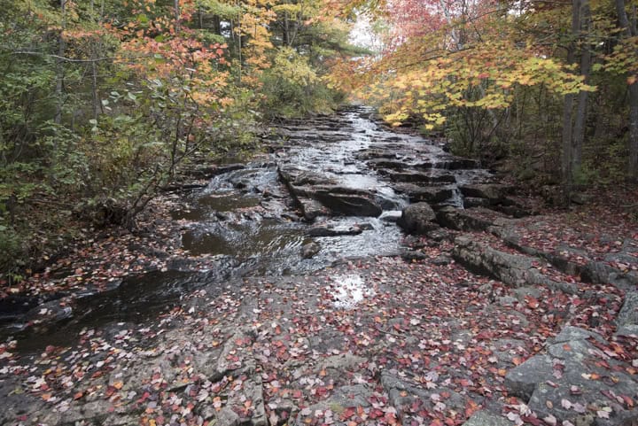 On rainy days if you use a polarizing filter the black rocks are the perfect background for the brilliant red maple leaves that fall from the canopy above leaving the stream bed beautifully littered with thick splashes of red. The pic below shows the first 100′ of the stream.