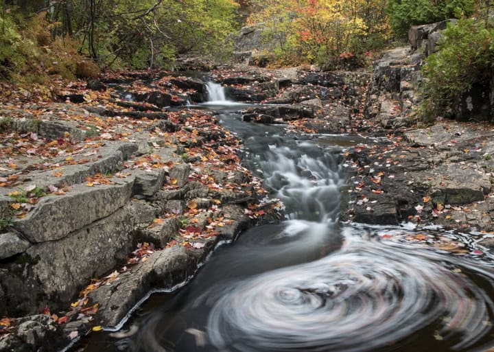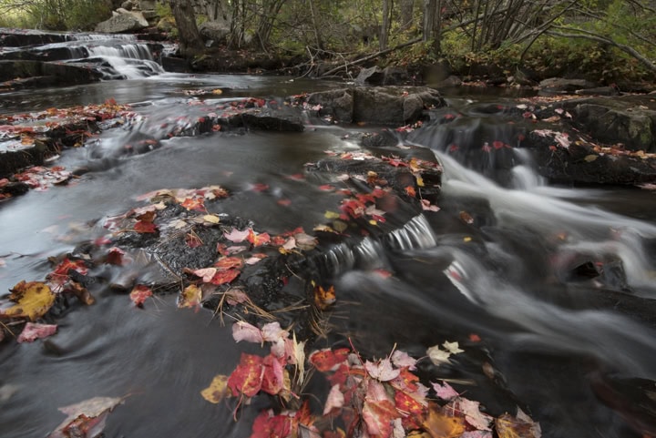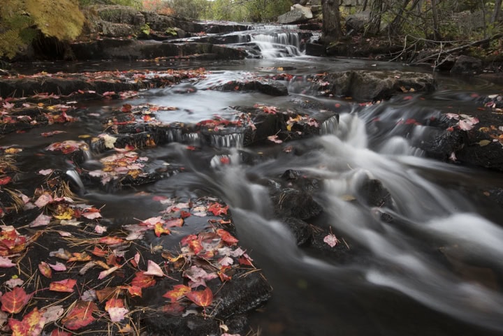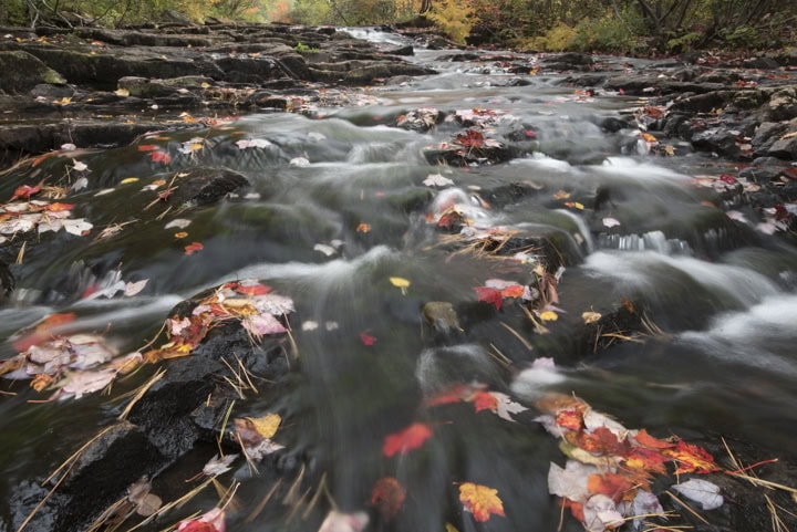 All of the photos were taken with a Nikon D750 camera and the Nikor 16-35mm lens with a tripod and a polarizing filter. Notice the low perspective to emphasize the leaves and the littleripples and falls. The exposure was about 4 seconds at f22.