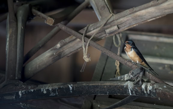 I had a little fun with a pair of barn swallows in the horse barn on the dairy farm where I help with chores. The pair was nesting 20′ back from the big doors and as I watched them I saw that they frequently perched on the old horse tack stored in the beams of the roof.