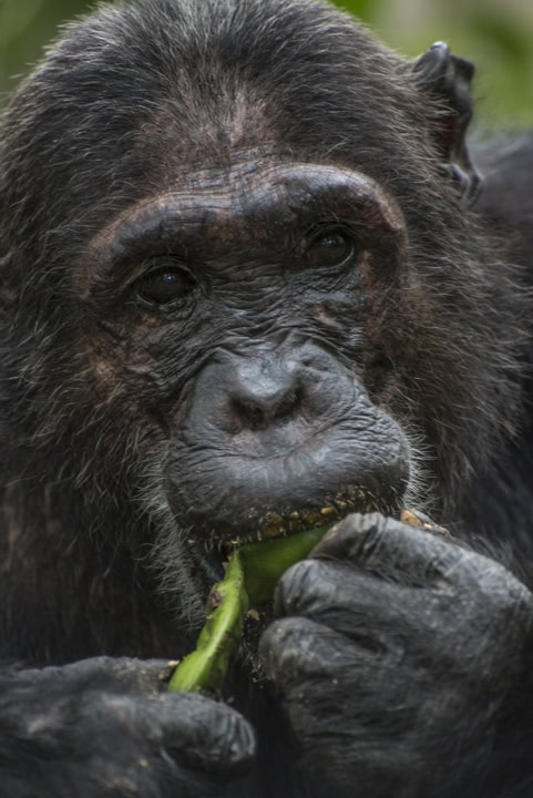 Photographing chimps at eye level either means getting a tree level perspective as I talked about in my last blog or finding a cooperative chimp on the ground. This is Primus, the alpha male of the chimp troop we visited. He was feeding about 40′ away so I sat down and started to compose a shot. As I sat there though he came closer to me and then closer still, eventually sitting 6 feet away from me eating leaves! Shot with my Nikon 70-300 at f5.6 at ISO 3200.