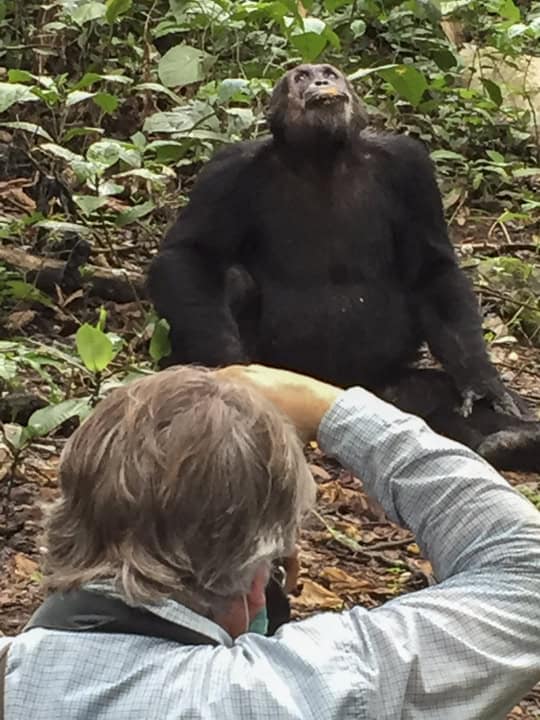 Because he was close and getting closer I wasn’t allowed to move. If I had been standing I could not have sat down when he approached and my photos would’ve been far less compelling. Because I was thinking about photographing at the chimp’s eye level I was ready when he so nicely got closer. Then all I had to do was wait for him to look at me.
