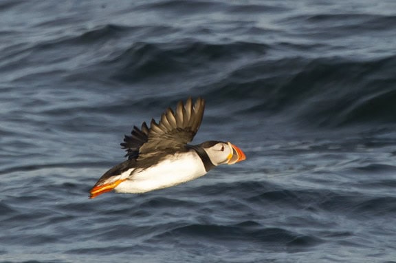 I was just about to give up when a pair of puffins floated reasonably close to the boat, about 100 feet away. Even shooting at 450mm the birds were but specks in my viewfinder. Just about when I was ready to give up, one of them took off heading toward the boat. As it corrected its course I got off a burst of 8 shots- one of which came out well enough to use in my next book. This is not a testament to my skill as a photographer but instead a testament to the incredible quality of the sensor in my Nikon D3s. The image shown here is cropped down severely from the original- I cropped down to about 1/8 of the frame. Thank you Nikon.