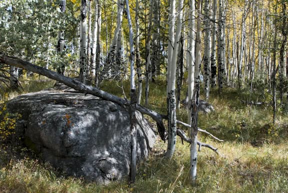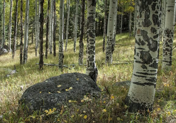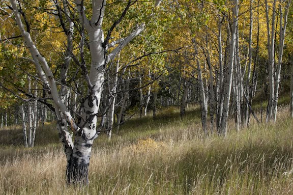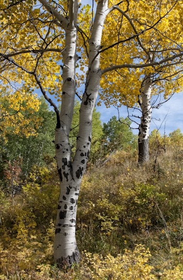 I was out for about 2 hours walking up through the still green aspens to the golden aspens in the high meadows above. I took most the shots at f11 at ISO 500. This gave me a shutter speed of at least 250th of a second so hand holding the camera wasn’t an issue. But because I was hand holding I couldn’t do any compositions that required extreme depth of field. (Extreme depth of field compositions require the foreground to be very very close to the camera and therefore a very very small f-stop) Consequently, my foregrounds started at least 10 feet away so I didn’t need an aperture f16 or f22.