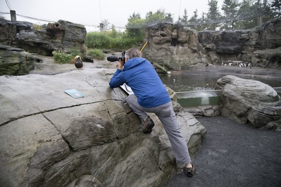 A new feature of this blog for you all to chew on. I’m going to present a picture and then ask if you see the things I think are photographically significant. I may give some broad hints if I am feeling nice. Here is the first one- This picture of me was taken at the Oregon Coast Aquarium in Newport, Oregon in July. This is a teaching shot I set up during a workshop. I am trying to get a head shot of a tufted puffin. Study the image and count the photographically significant things you see.