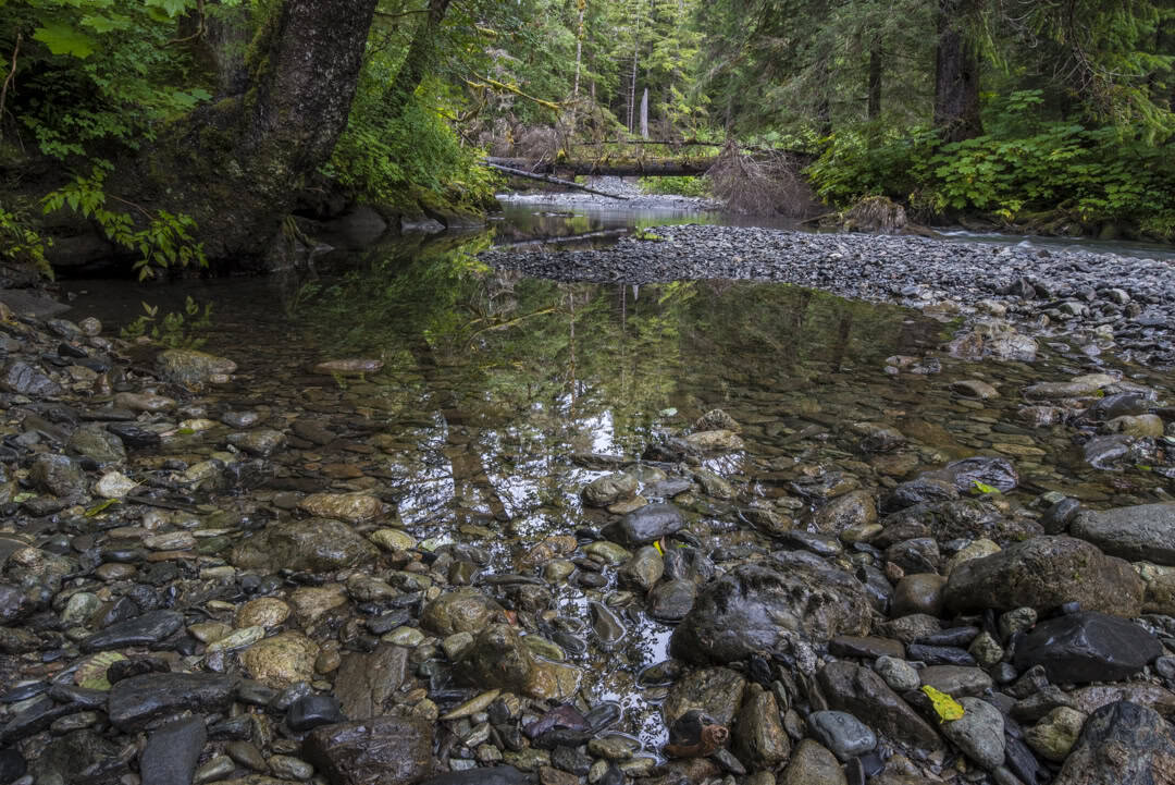 As I walked up Indian River in Sitka, Alaska I wanted to do a broad landscape showing both the river and the old-growth forest on either side. The only way to do this, to get a wide enough reach to get both sides of the river while in the river is with a wide angle lens. So I put my trusty 24-120mm Nikon lens on and starting looking for compositions.