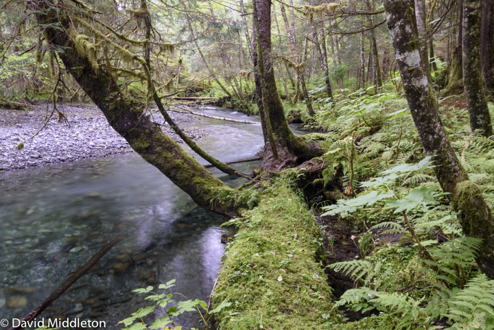 This is Indian River in Sitka, Alaska. There are huge old-growth Sitka spruces off to the right of this scene (see previous posts) and pink and dog salmon in the river. Just past the huge spruces there is an active bear trail where Grizzlies walk to avoid the people on the the trail on the other side of the river. If you stopped to listen you would here Pacific wrens chittering in the ferns and kinglets sighing in the boughs above. Pay attention to the gravel bank because there’s been a water ouzel feeding there. All of this accompanied by the liquid lullaby of the passing water. In case you are wondering, this is paradise.