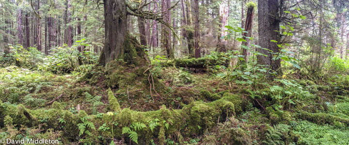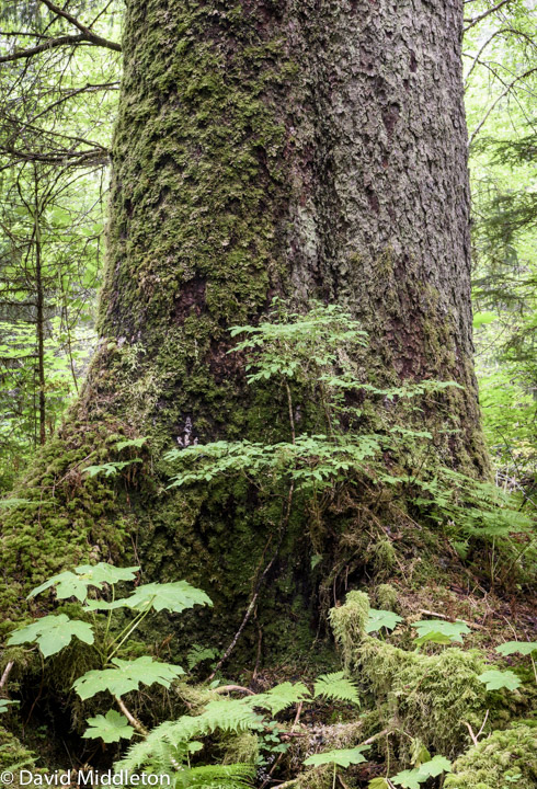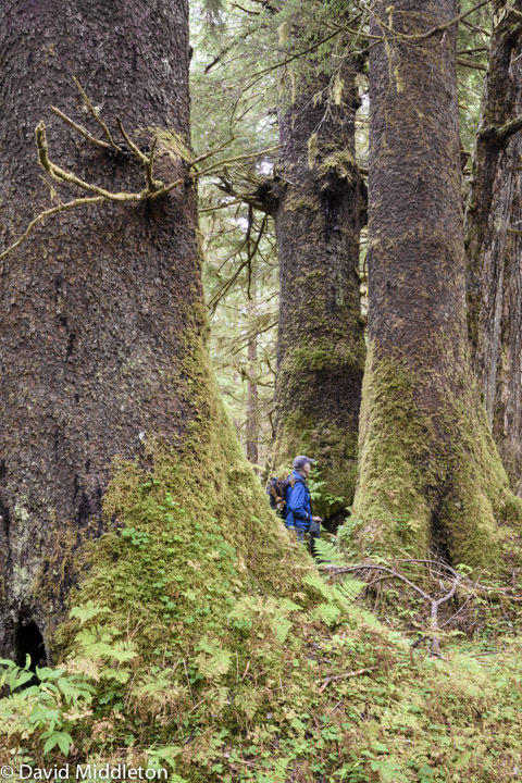 On my recent trip to Sitka, Alaska I found a beautiful grove of huge Sitka Spruce trees in the perfect light and the perfect situation. What wasn’t perfect was how I photographed them. A few of my photos show a larger than normal tree but none of them show how enormous the trees were. None except for the ones where I included a person in the photo for comparison (that’s Bob in the blue rain coat).